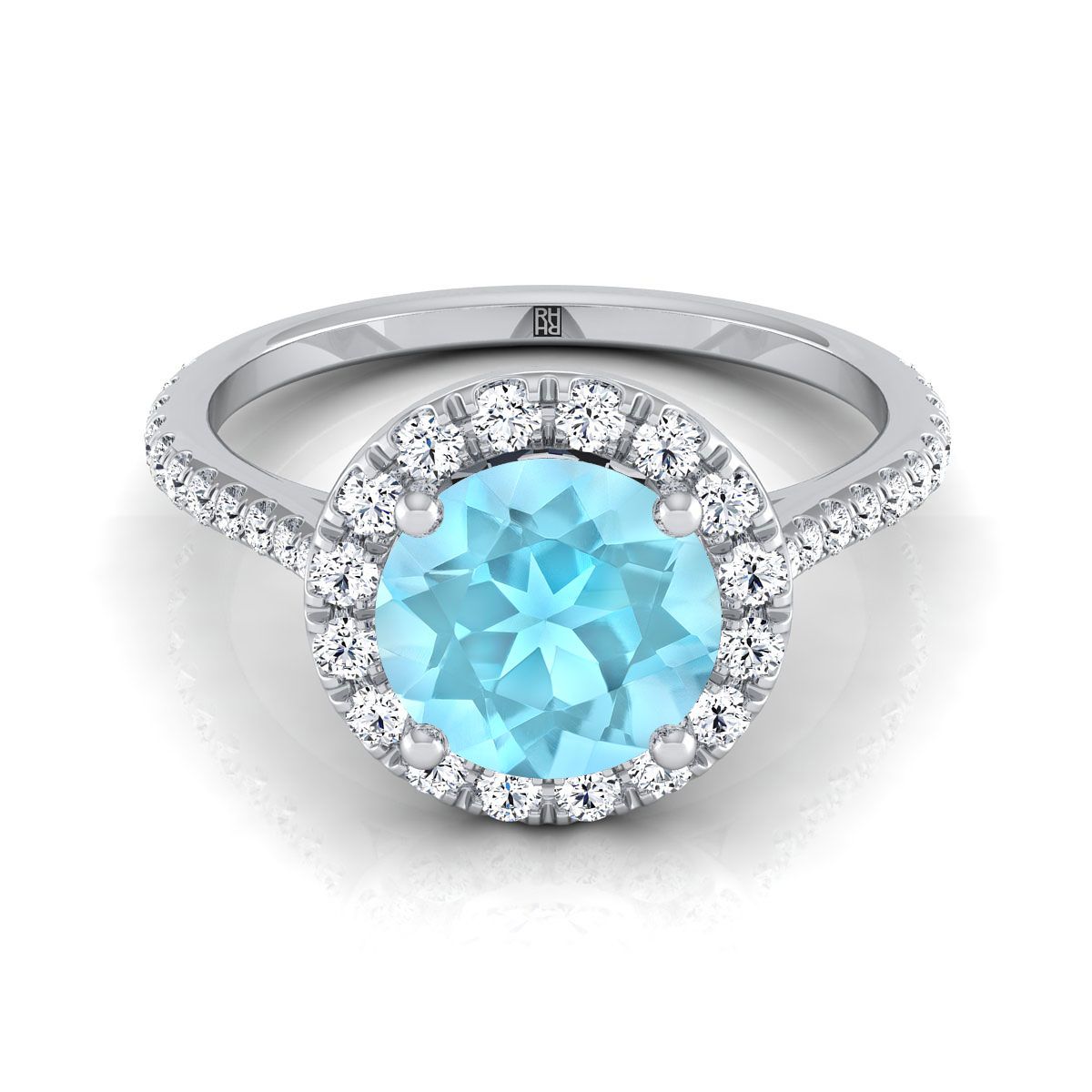 Platinum Engagement Ring With 6 Mm Round Aquamarine Center Stone And 40 Round Brilliant Diamonds Weighing 0.40ctw