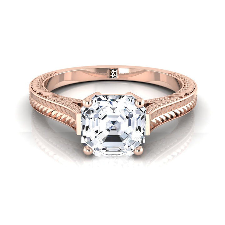 Understated Elegance, This Asscher Cut Diamond Engagement Ring Showcases An Antique Inspired Engraved Design With A Classic Millgrain Finish In 14k Rose Gold