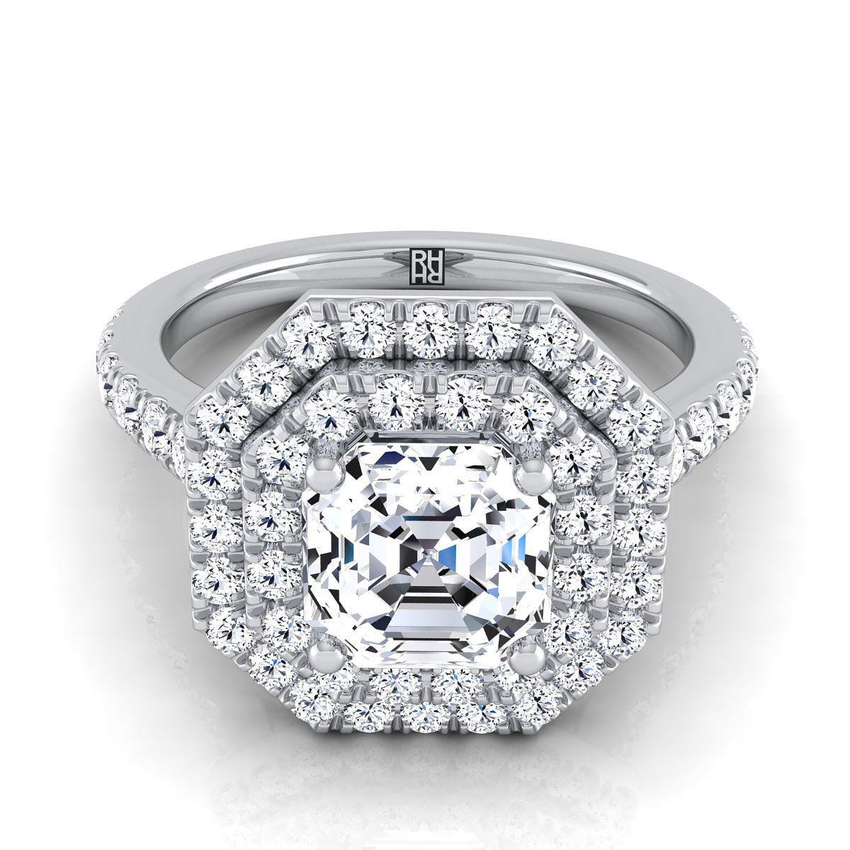 Exquisitely Handcrafted, This Double Pave Asscher Cut Halo Engagement Ring Showcases Brilliant Cut Diamonds (h-i/vs 0.75 Ctw) Beautifully Pave Set In A Classic 18k White Gold Setting.