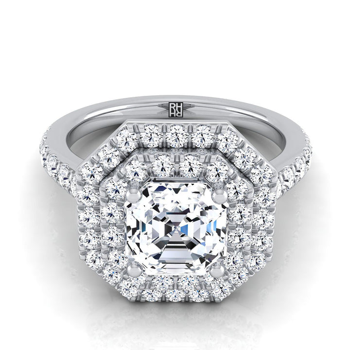 18K White Gold Asscher Cut Double Pave Halo with Linear Diamond Engagement Ring -7/8ctw