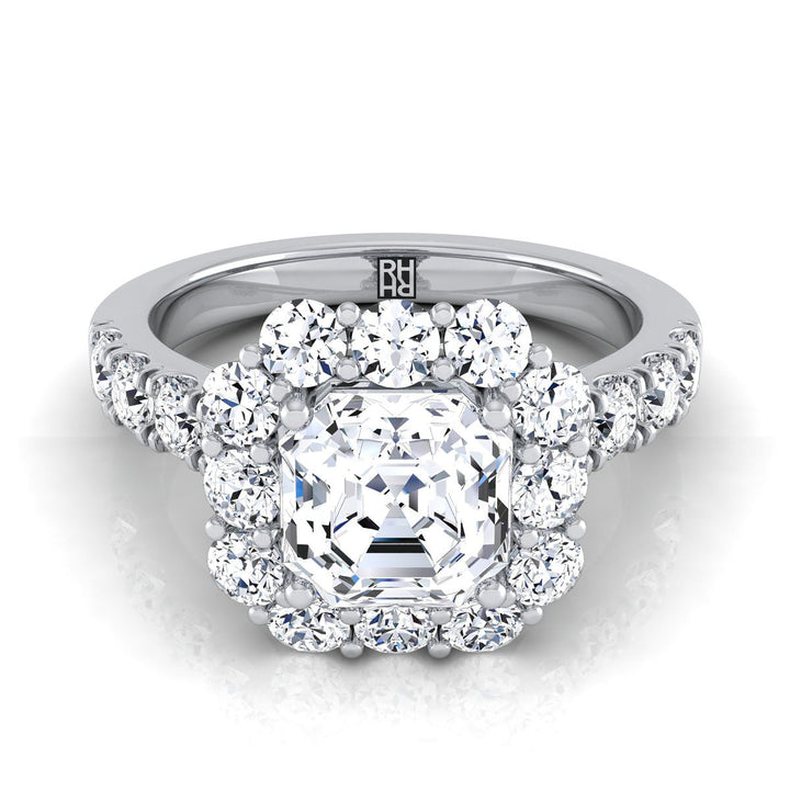 18K White Gold Asscher Cut Diamond Luxe Style French Pave Halo Engagement Ring -1-1/10ctw