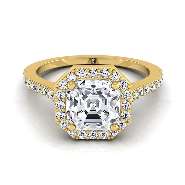 18K Yellow Gold Asscher Cut Classic French Pave Diamond Halo and Linear Engagement Ring -1/3ctw