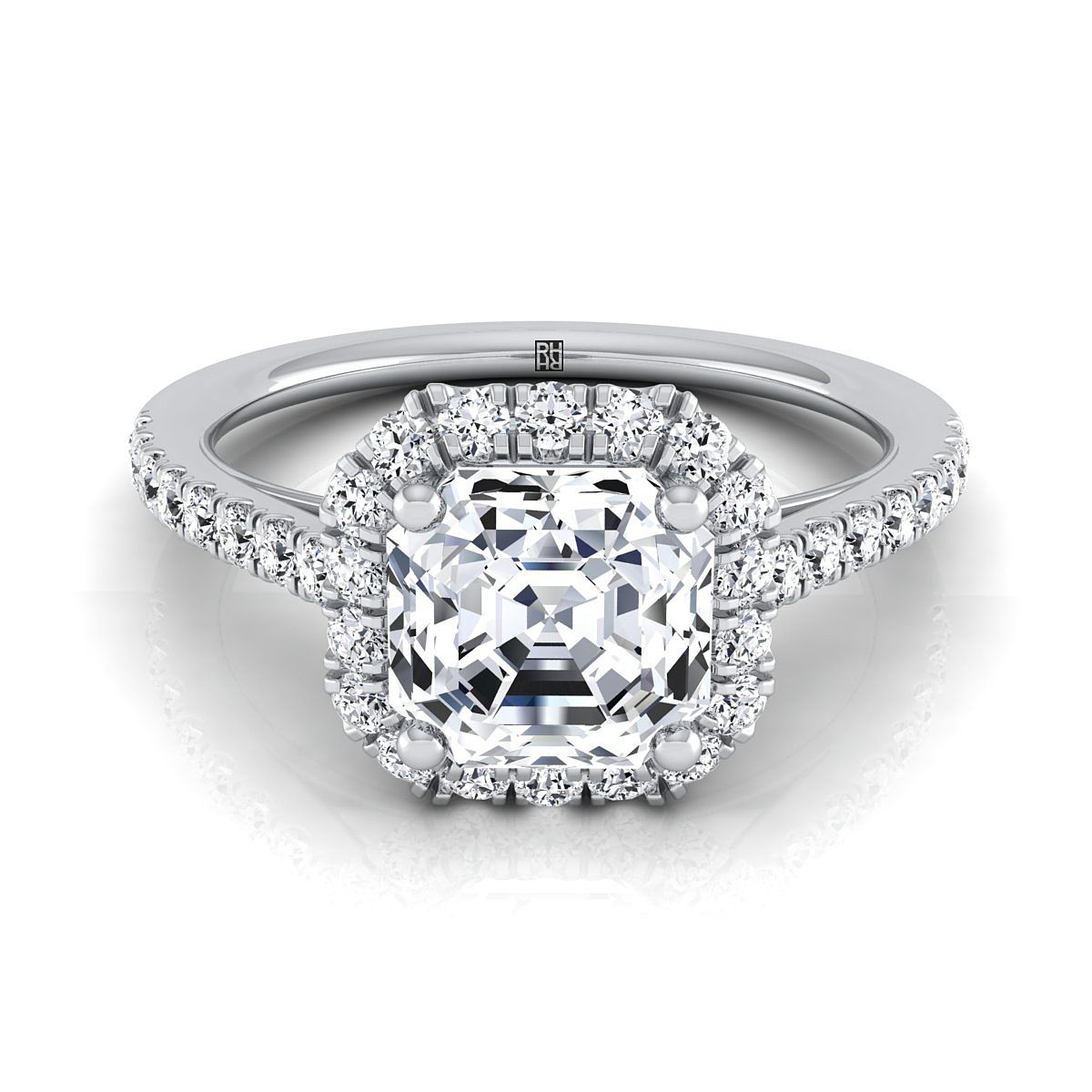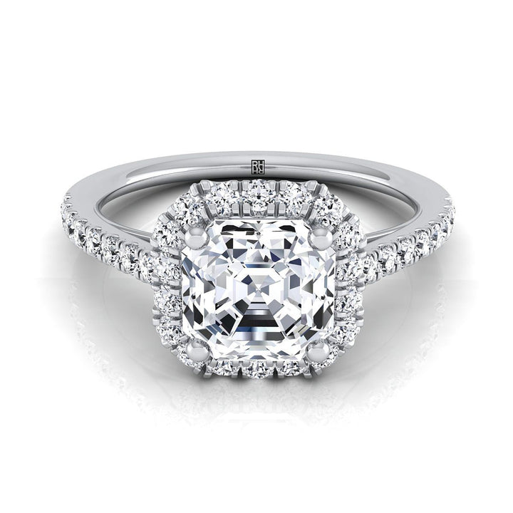 18K White Gold Asscher Cut Diamond Petite Halo French Pave Engagement Ring -3/8ctw