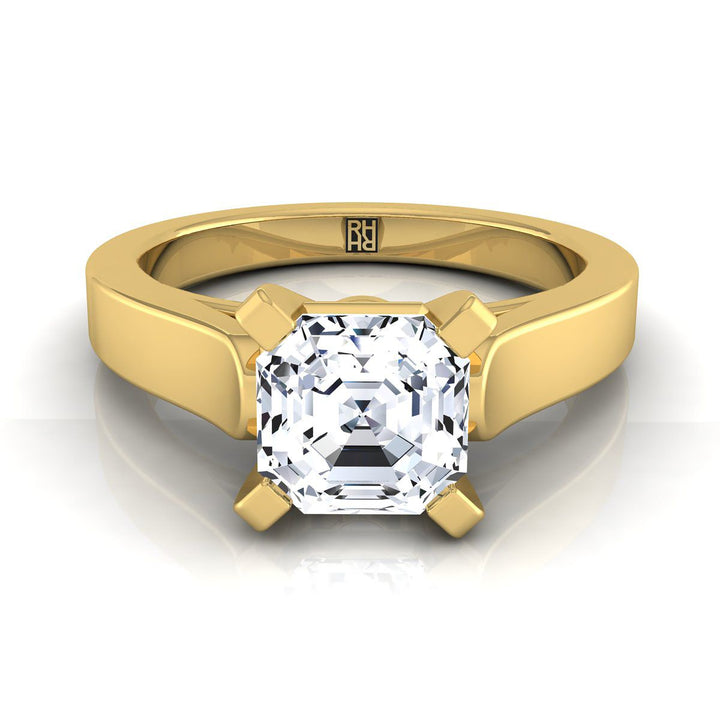Understated Elegance, This Asscher Cut Diamond Solitaire Engagement Ring Showcases A Cathedral Center Setting With A High Polished Squared Edge Shank In 18k Yellow Gold