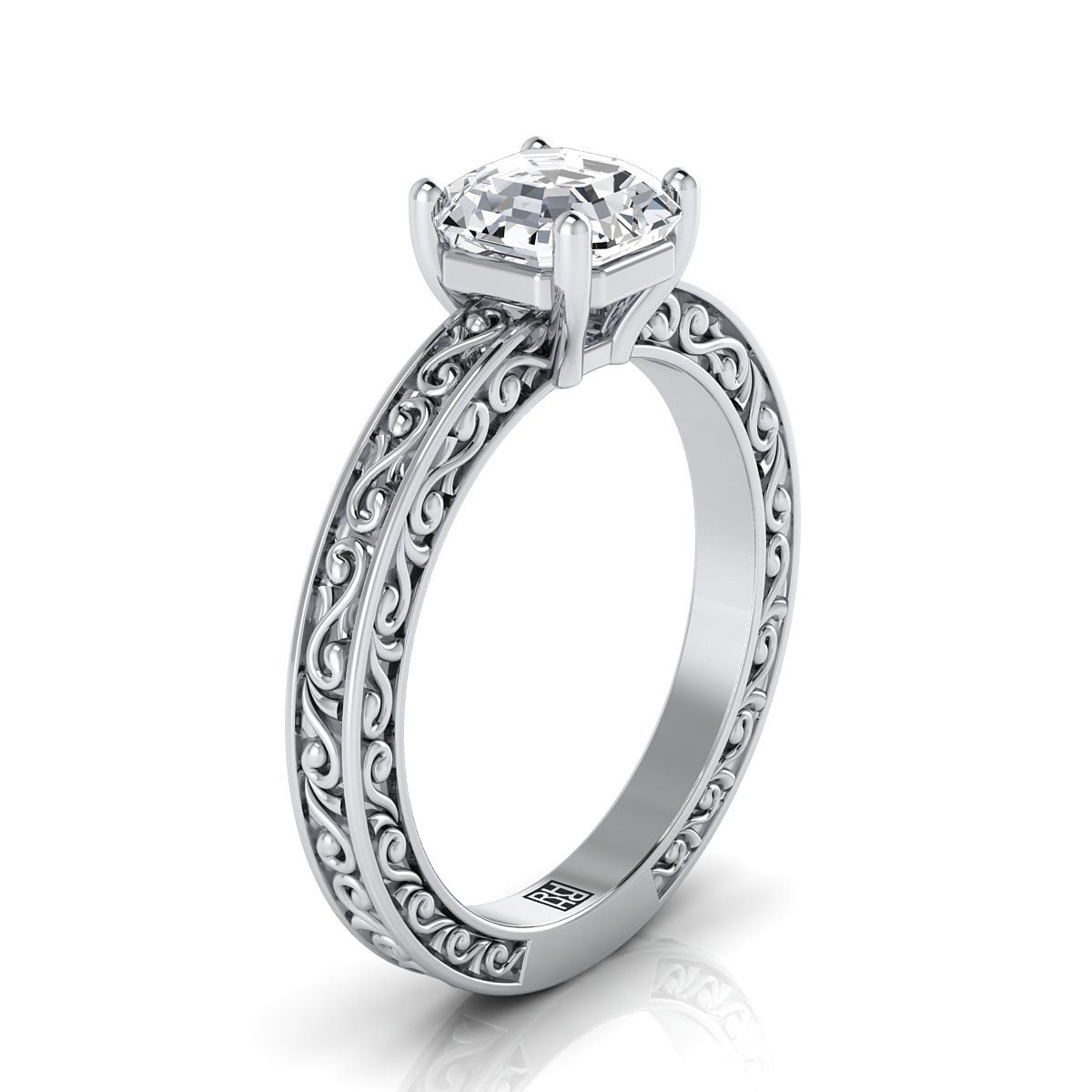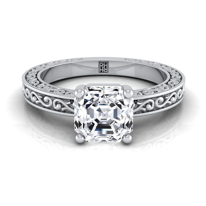 18K White Gold Asscher Cut Hand Engraved Scroll Vintage Solitaire Engagement Ring