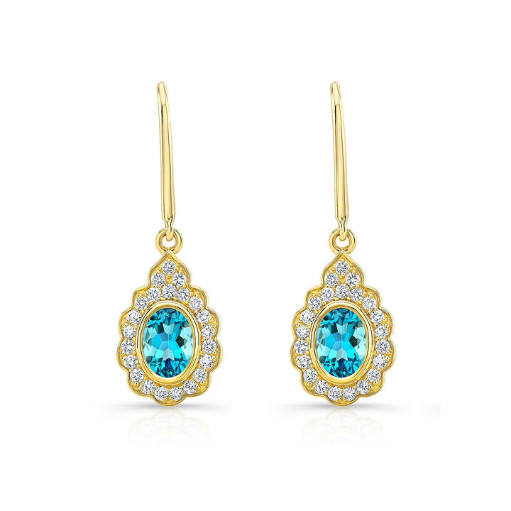 Blue Topaz And Diamond Oval Bezel Leverback Earrings With Teardrop Scallop Frame In 14k Yellow Gold (7x5mm)