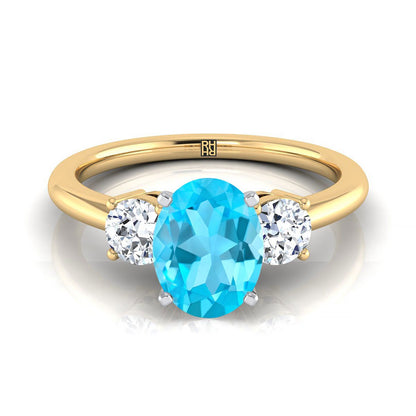 14K Yellow Gold Oval Swiss Blue Topaz Perfectly Matched Round Three Stone Diamond Engagement Ring -1/4ctw