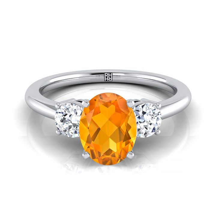 18K White Gold Oval Citrine Perfectly Matched Round Three Stone Diamond Engagement Ring -1/4ctw