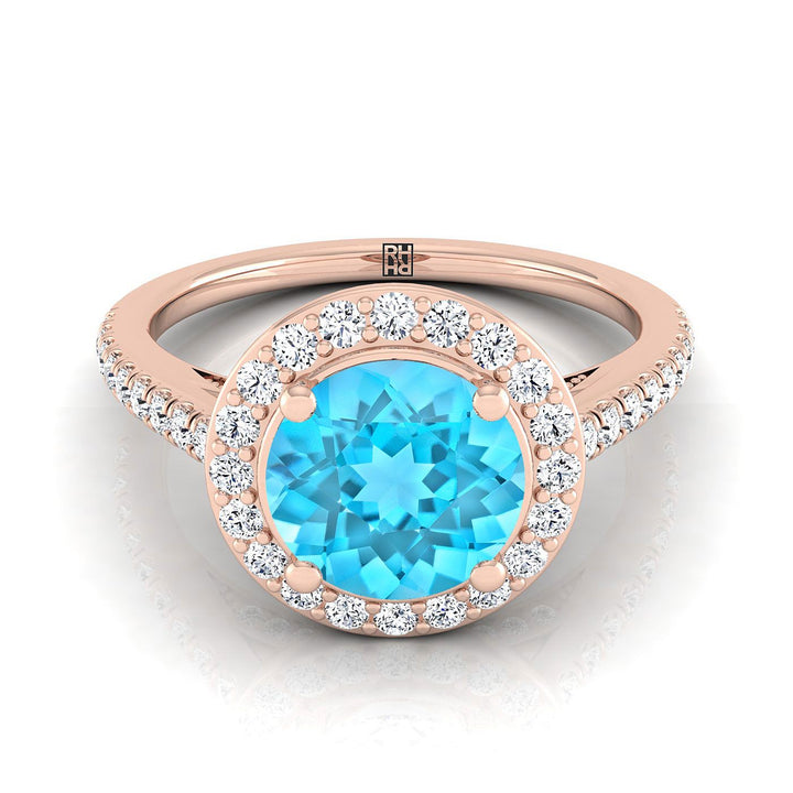 14K Rose Gold Round Brilliant Swiss Blue Topaz French Pave Halo Secret Gallery Diamond Engagement Ring -3/8ctw