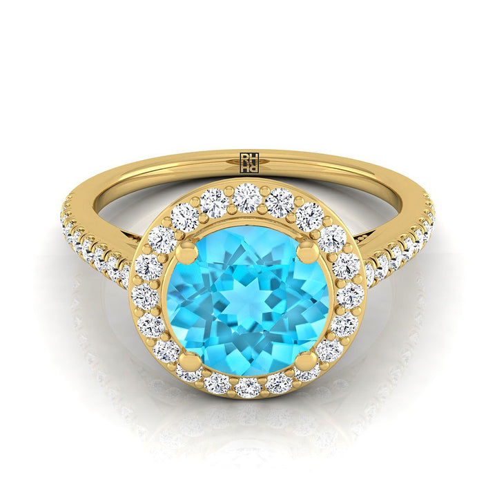 18K Yellow Gold Round Brilliant Swiss Blue Topaz French Pave Halo Secret Gallery Diamond Engagement Ring -3/8ctw