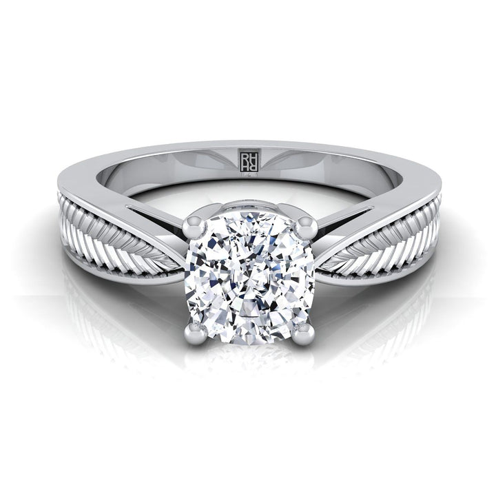 Bold And Elegant, This Cushion Cut Diamond Solitaire Engagement Ring In 18k White Gold Showcases An Exquisite Leaf Textured Shank. Includes 4 Prong Setting For 1.25ctw Center