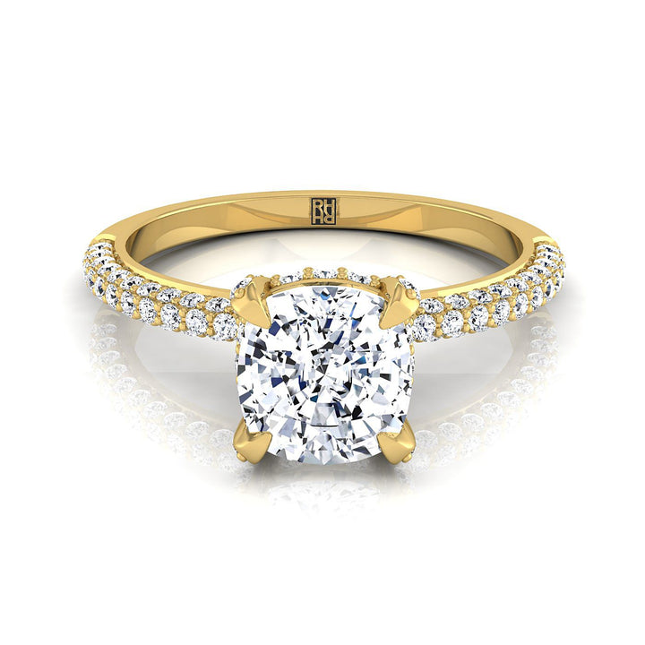 18K Yellow Gold Cushion Diamond Encrusted Claws and Triple Pave Engagement Ring -1/2ctw