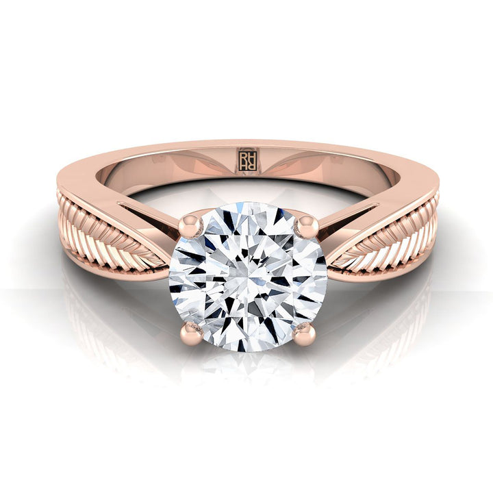 14K Rose Gold Round Brilliant Vintage Inspired Leaf Pattern Pinched Solitaire Engagement Ring