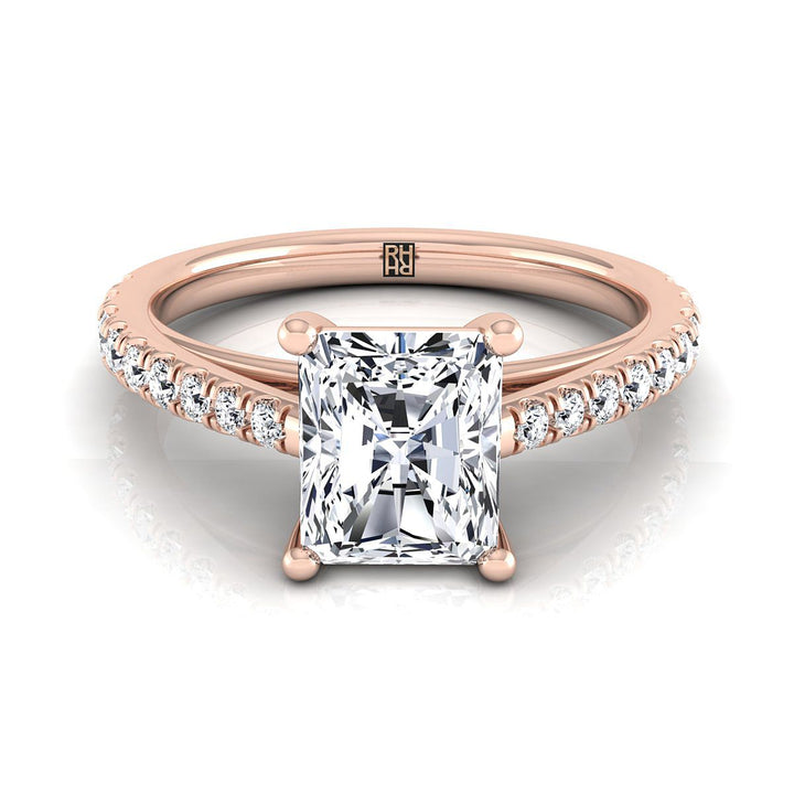 14K Rose Gold Radiant Cut Center Diamond French Pave Cathedral Style Solitaire Engagement Ring -1/4ctw