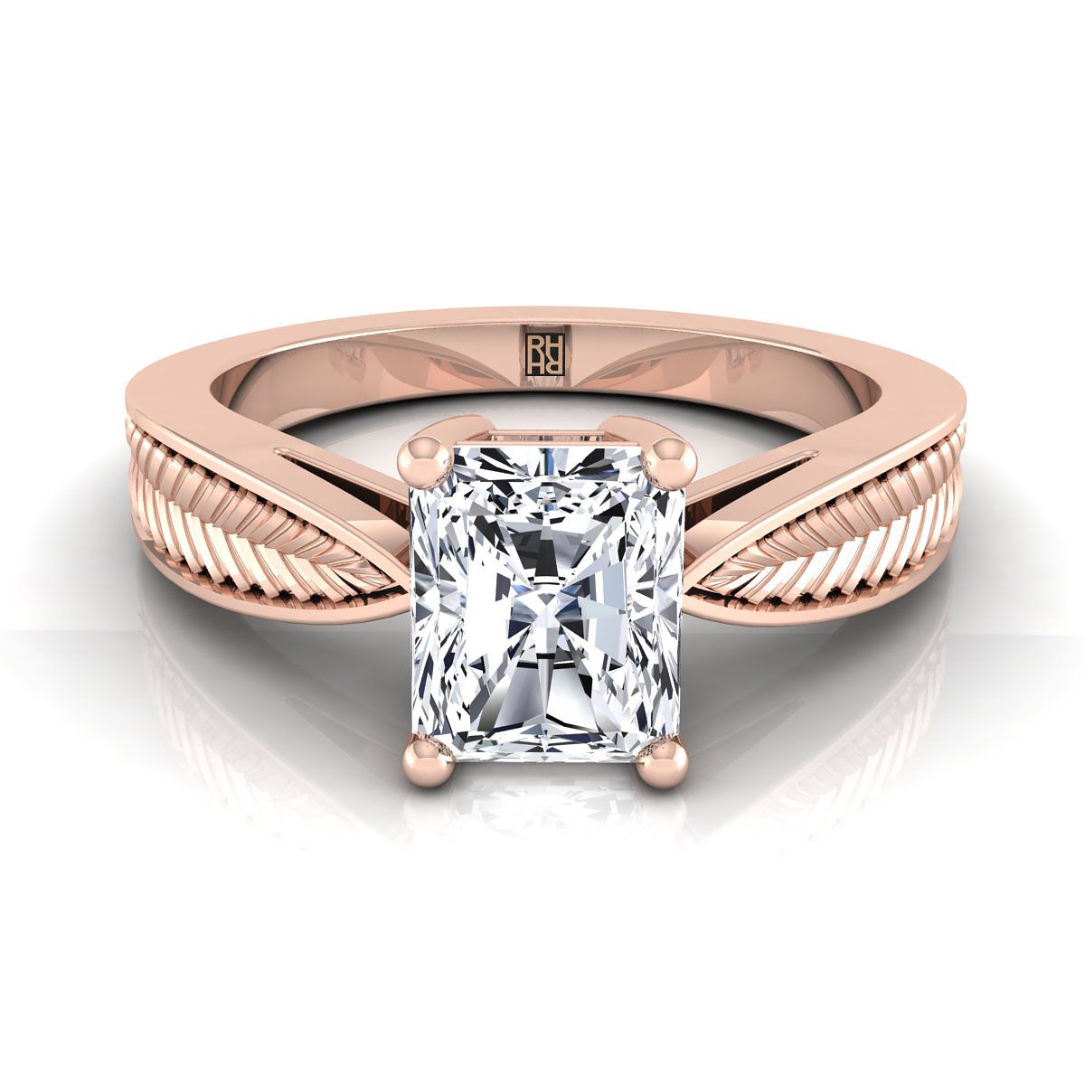 Bold And Elegant, This Radiant Cut Diamond Solitaire Engagement Ring In 14k Rose Gold Showcases An Exquisite Leaf Textured Shank. Includes 4 Prong Setting For 1.25ctw Center