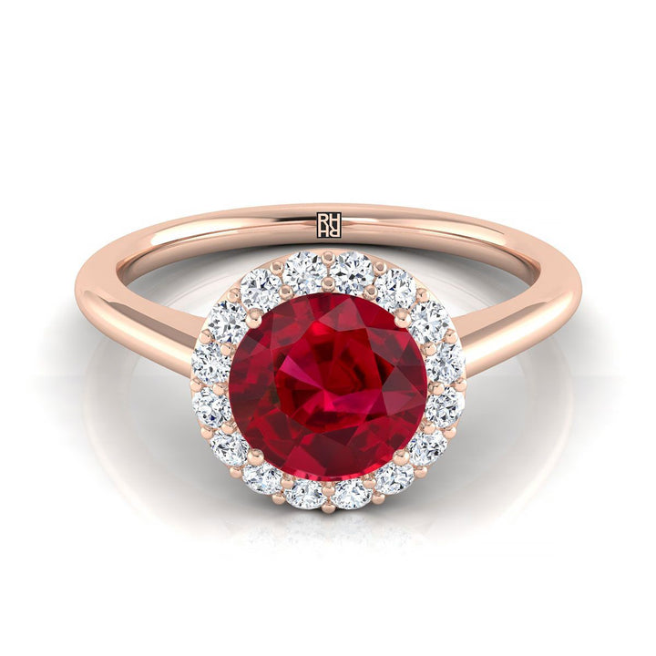 14K Rose Gold Round Brilliant Ruby Shared Prong Diamond Halo Engagement Ring -1/5ctw