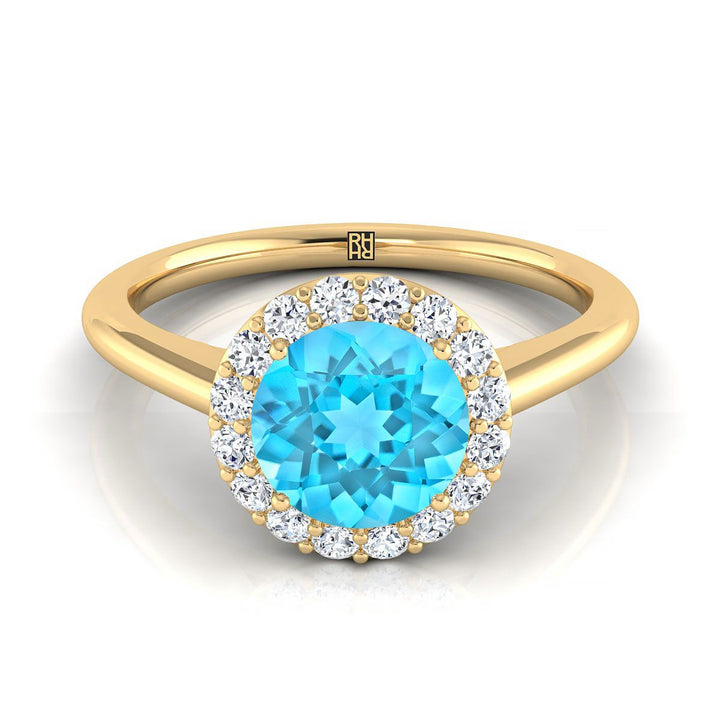 18K Yellow Gold Round Brilliant Swiss Blue Topaz Shared Prong Diamond Halo Engagement Ring -1/5ctw