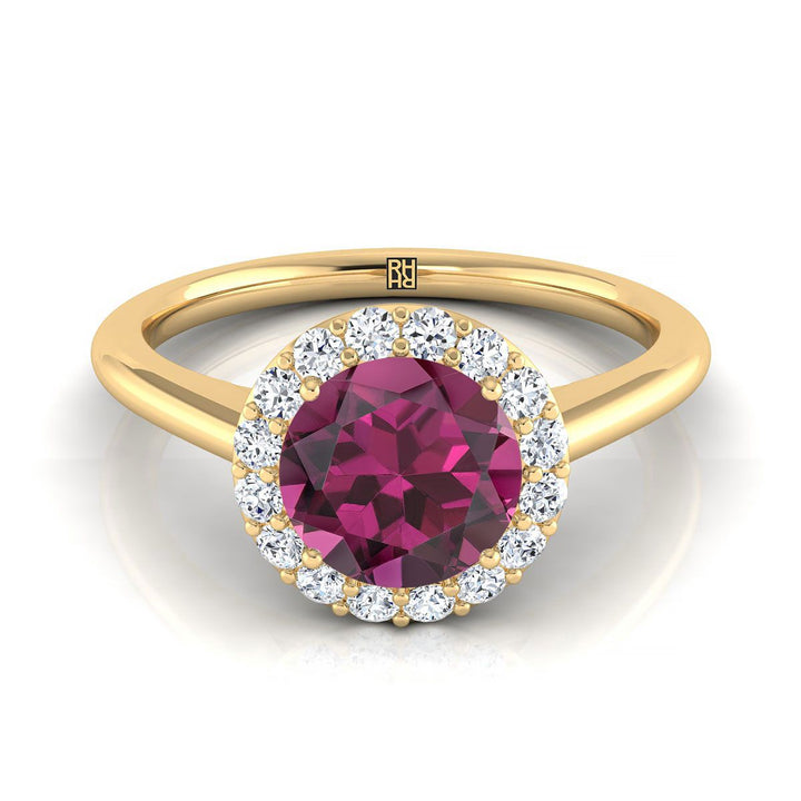 18K Yellow Gold Round Brilliant Garnet Shared Prong Diamond Halo Engagement Ring -1/5ctw