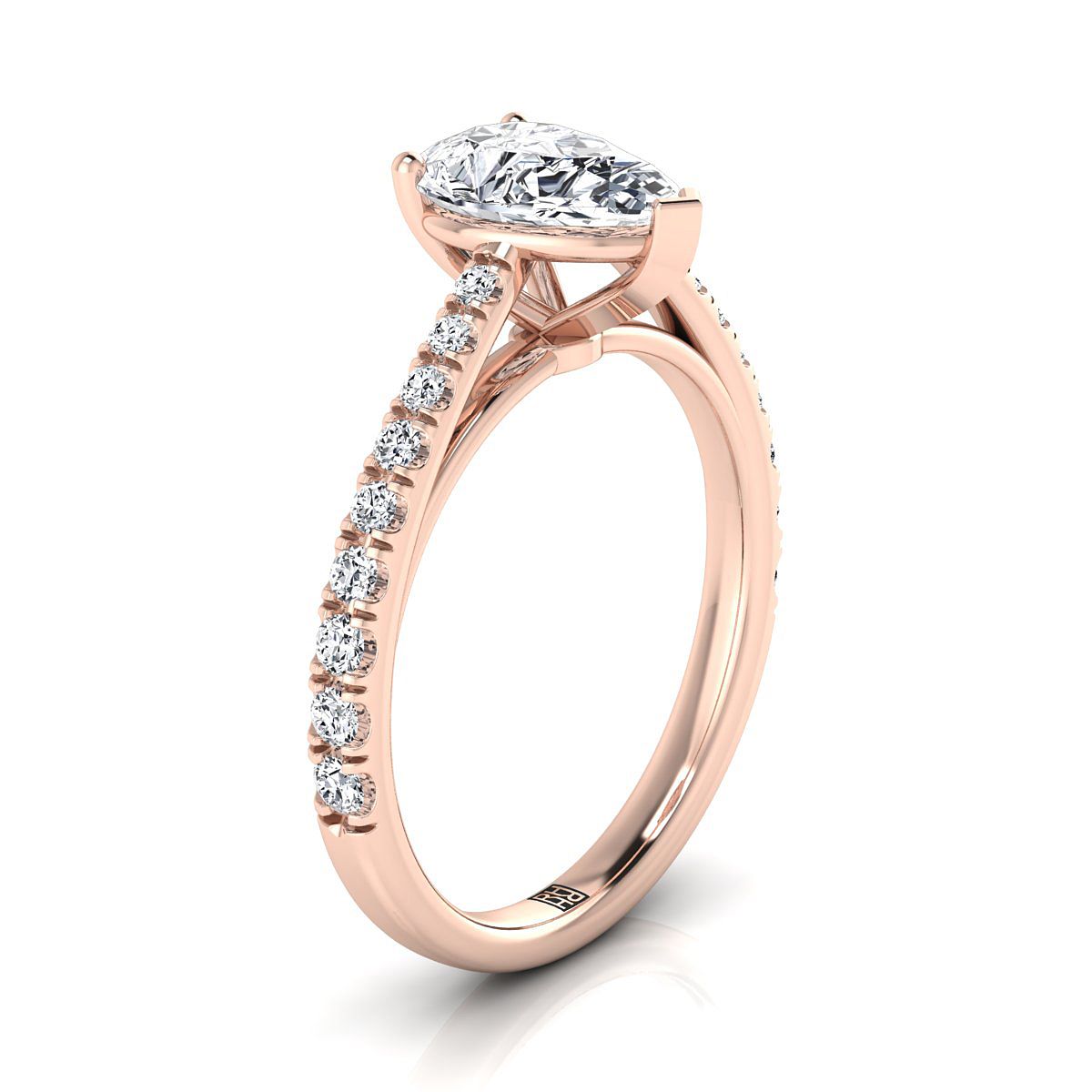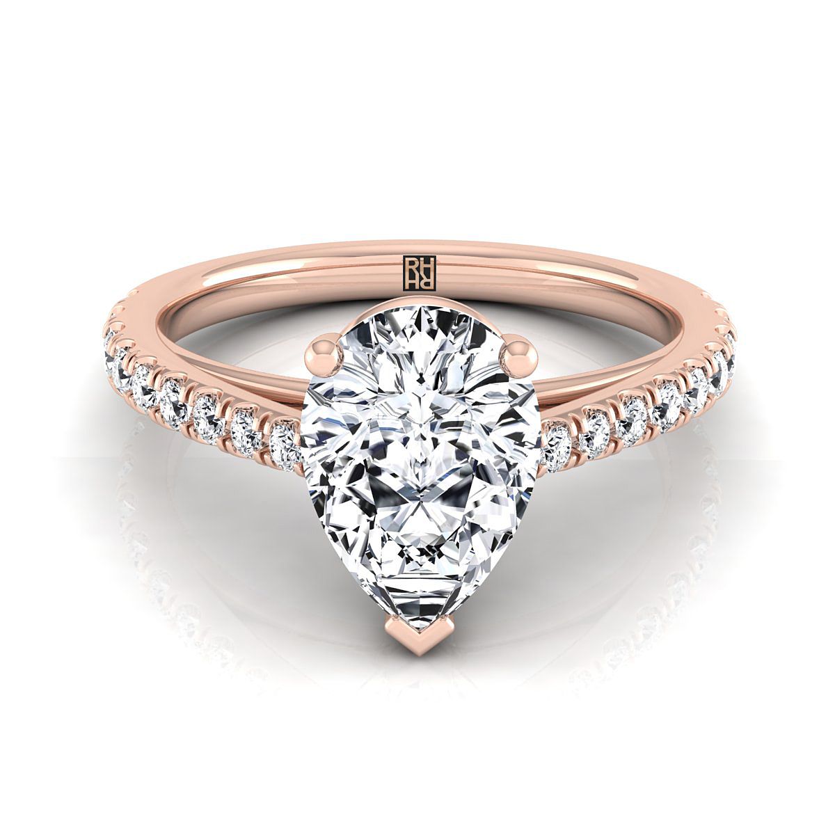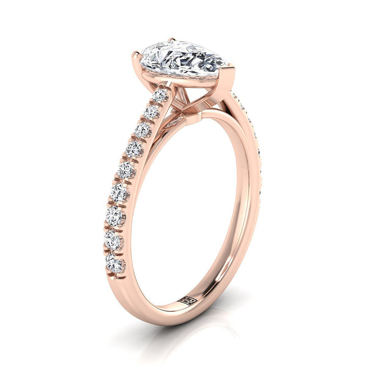 14K Rose Gold Pear Shape Center Diamond French Pave Cathedral Style Solitaire Engagement Ring -1/4ctw