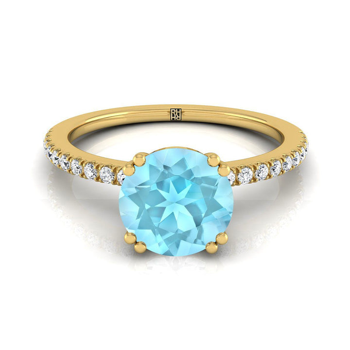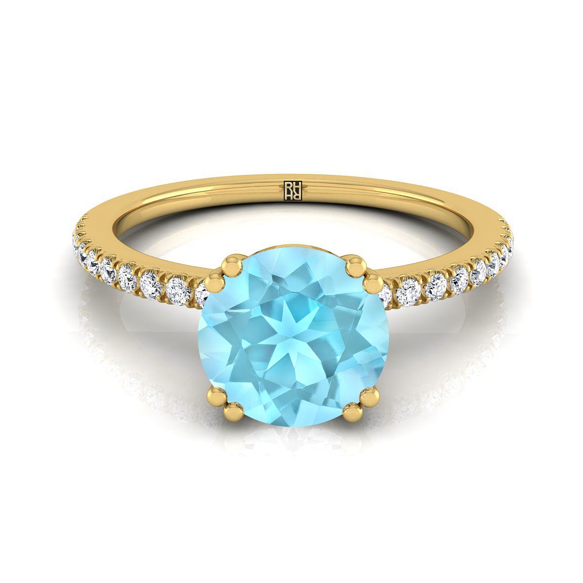 14K Yellow Gold Round Brilliant Aquamarine Simple French Pave Double Claw Prong Diamond Engagement Ring -1/6ctw