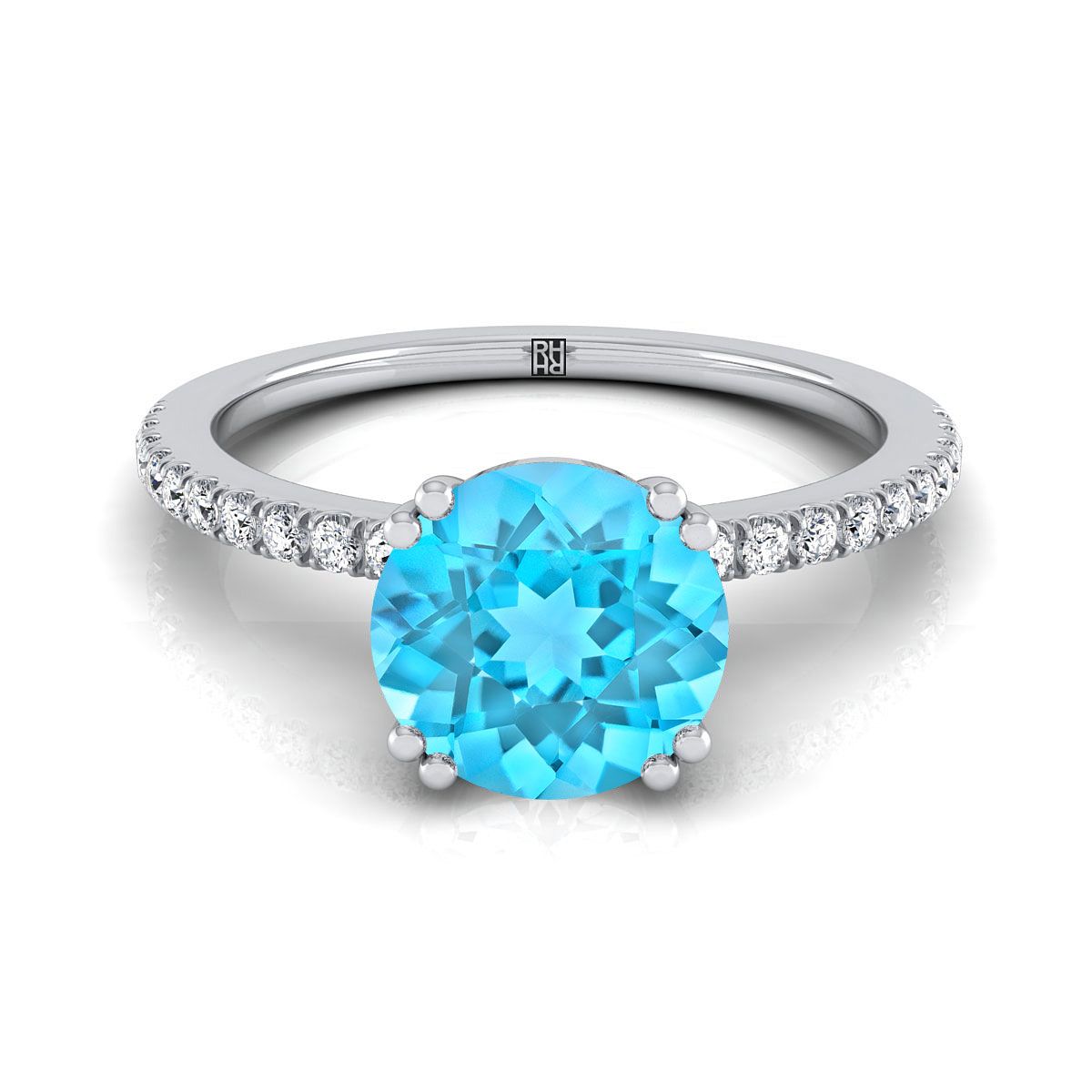 Platinum Round Brilliant Swiss Blue Topaz Simple French Pave Double Claw Prong Diamond Engagement Ring -1/6ctw