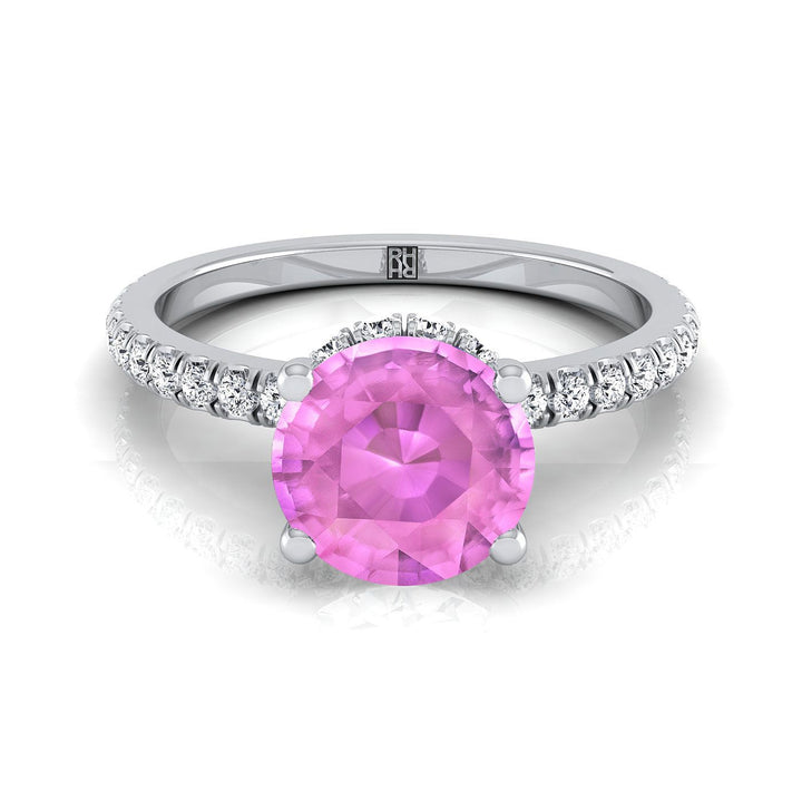 18K White Gold Round Brilliant Pink Sapphire Secret Diamond Halo French Pave Solitaire Engagement Ring -1/3ctw