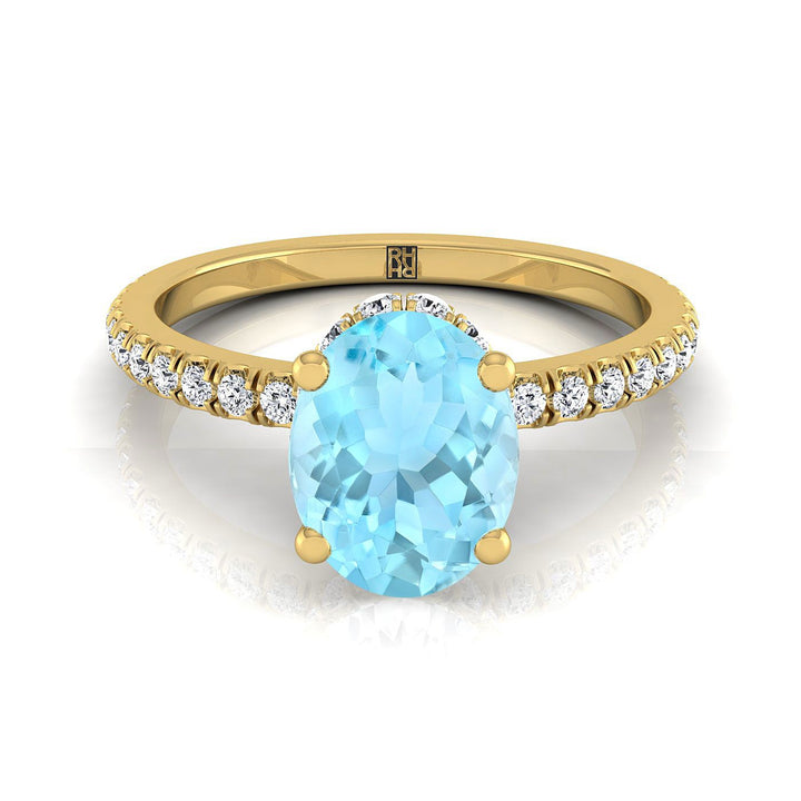 14K Yellow Gold Oval Aquamarine Secret Diamond Halo French Pave Solitaire Engagement Ring -1/3ctw