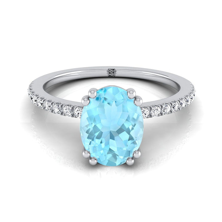 18K White Gold Oval Aquamarine Simple French Pave Double Claw Prong Diamond Engagement Ring -1/6ctw
