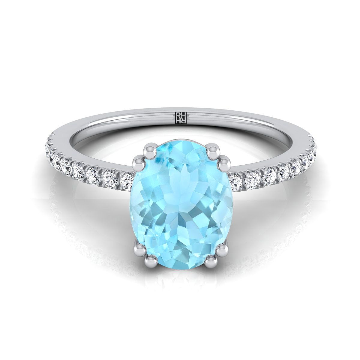 Platinum Oval Aquamarine Simple French Pave Double Claw Prong Diamond Engagement Ring -1/6ctw
