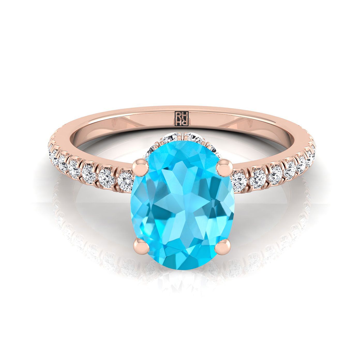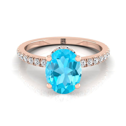 14K Rose Gold Oval Swiss Blue Topaz Secret Diamond Halo French Pave Solitaire Engagement Ring -1/3ctw