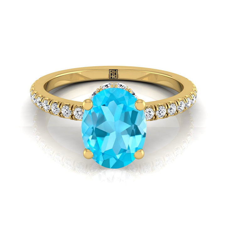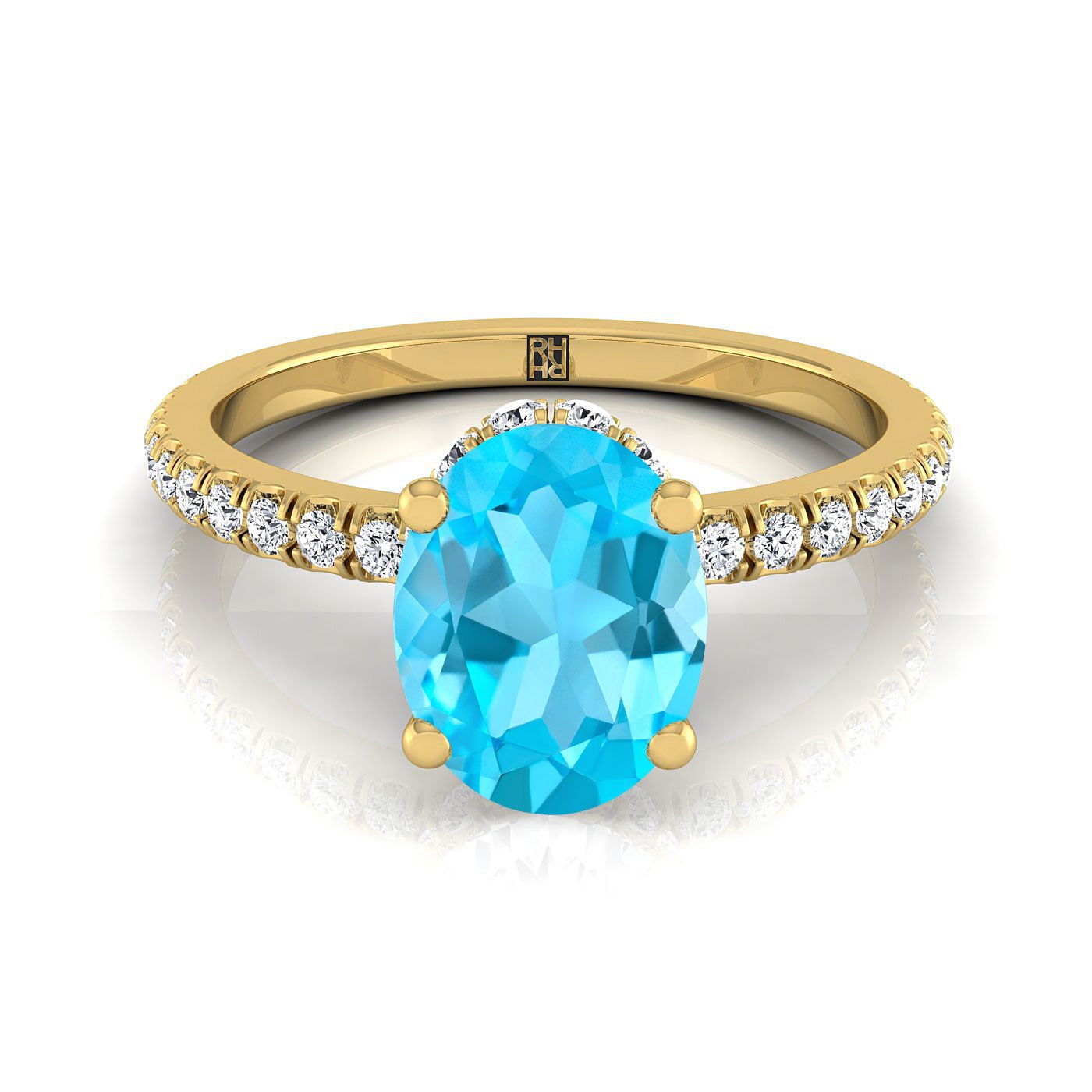 18K Yellow Gold Oval Swiss Blue Topaz Secret Diamond Halo French Pave Solitaire Engagement Ring -1/3ctw