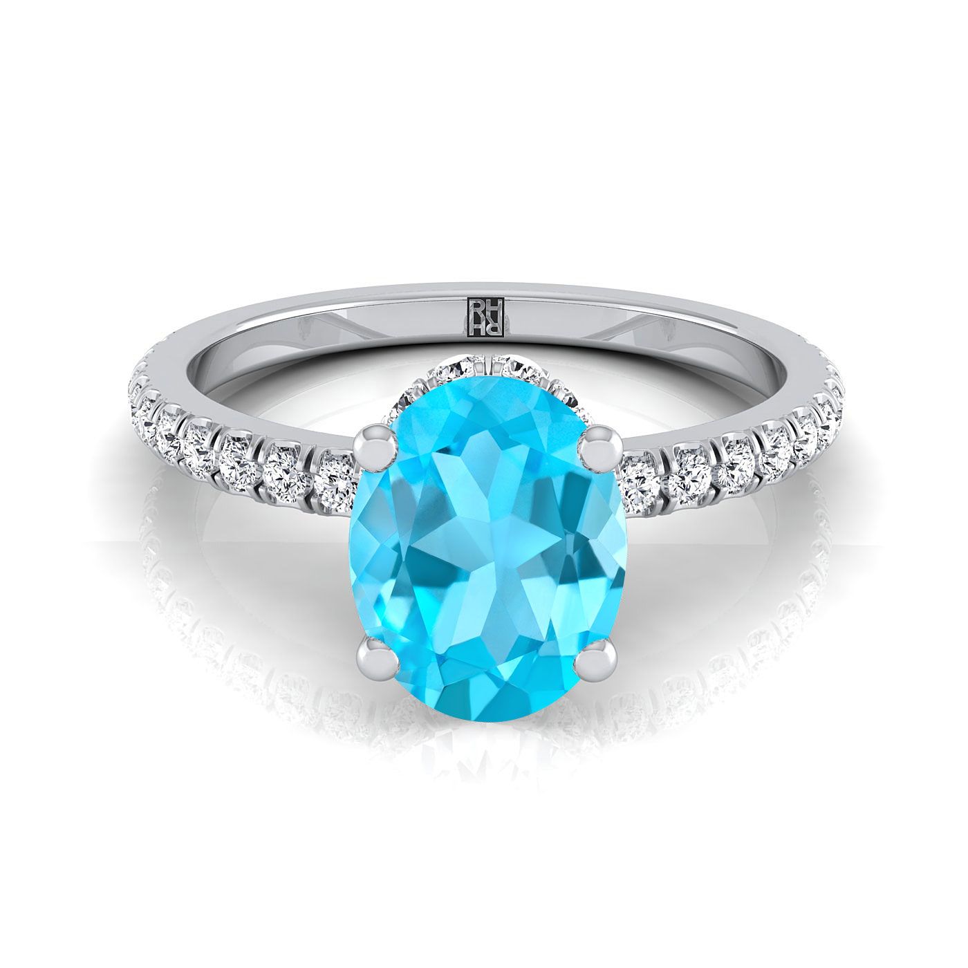 Platinum Oval Swiss Blue Topaz Secret Diamond Halo French Pave Solitaire Engagement Ring -1/3ctw