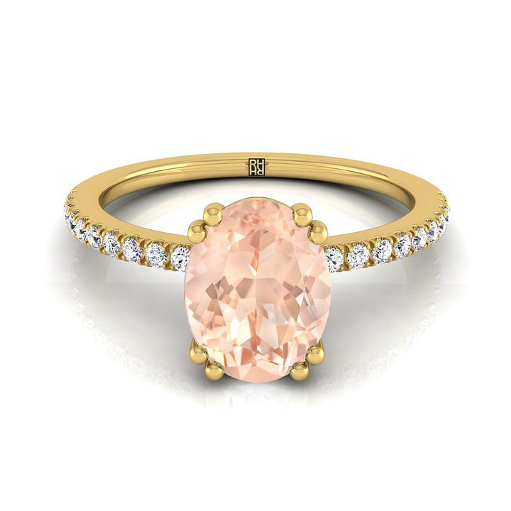 14K Yellow Gold Oval Morganite Simple French Pave Double Claw Prong Diamond Engagement Ring -1/6ctw