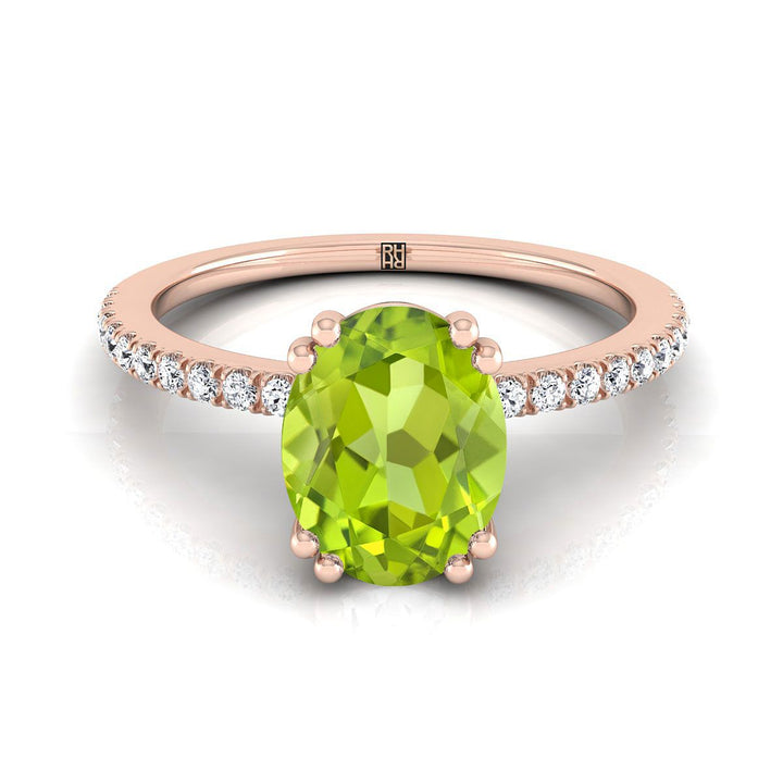 14K Rose Gold Oval Peridot Simple French Pave Double Claw Prong Diamond Engagement Ring -1/6ctw