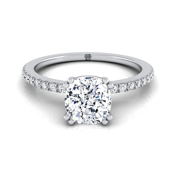 Platinum Cushion Diamond Simple French Pave Double Claw Prong Engagement Ring -1/6ctw