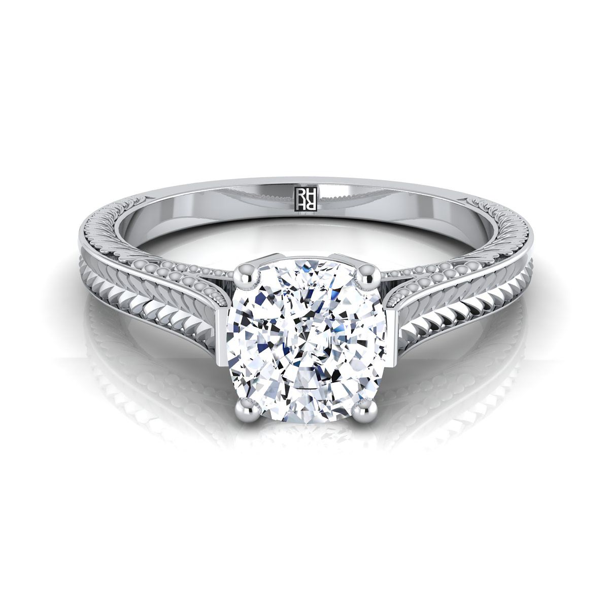 Platinum Cushion Hand Engraved Vintage Cathedral Style Solitaire Engagement Ring