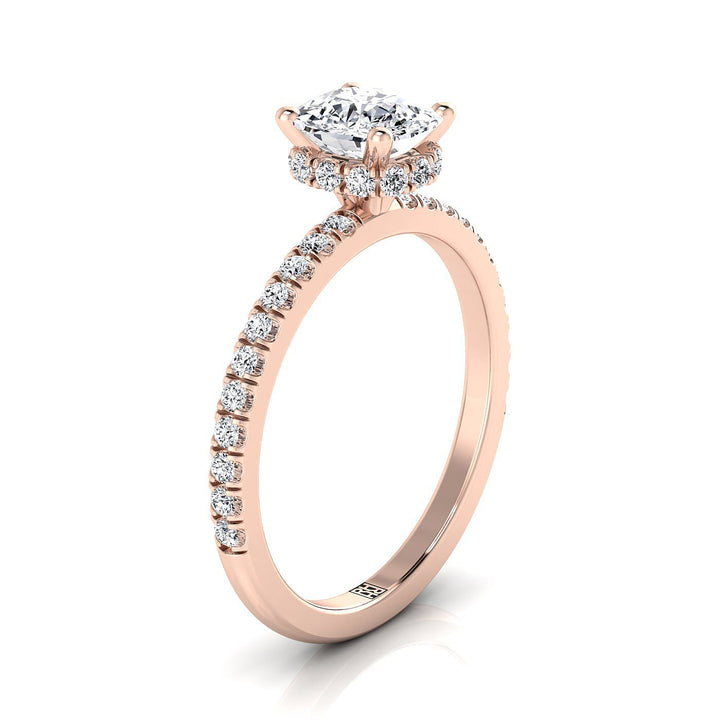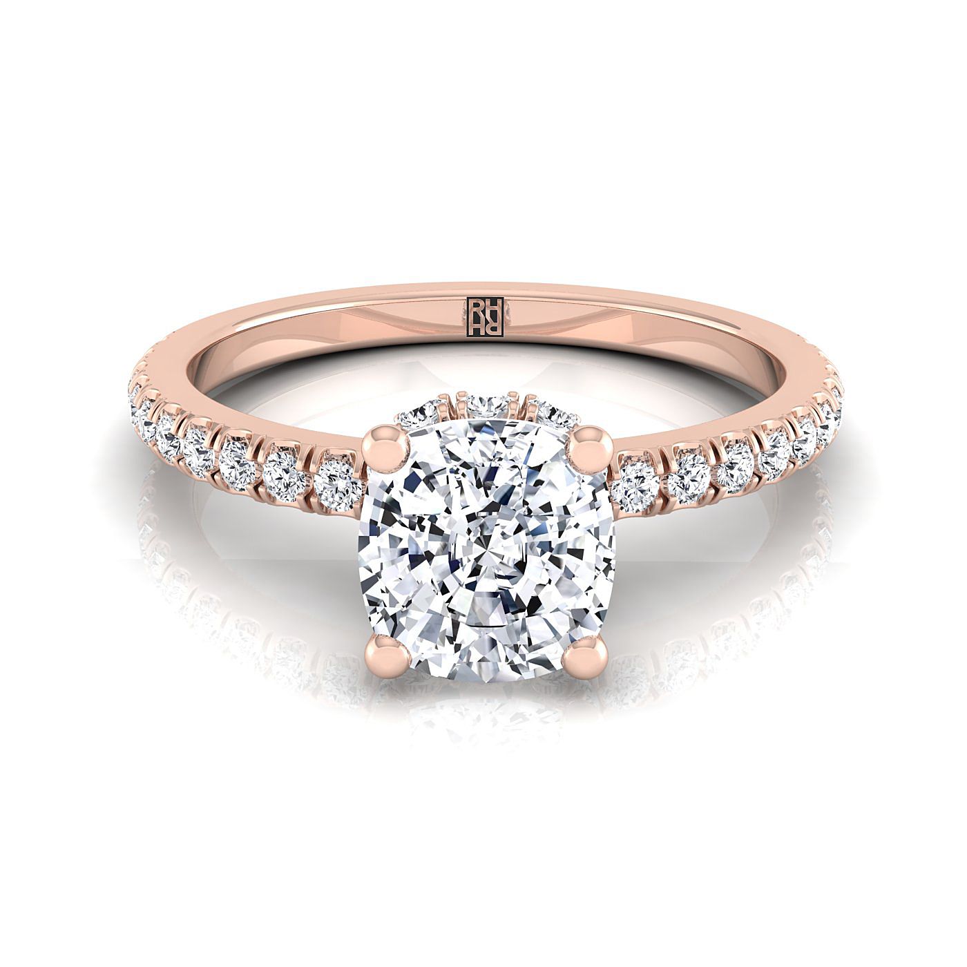 14K Rose Gold Cushion Diamond Secret Diamond Halo French Pave Solitaire Engagement Ring -1/3ctw
