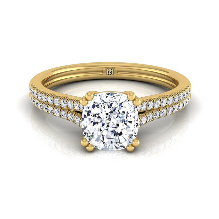 18K Yellow Gold Cushion Diamond Double Row Double Prong French Pave Engagement Ring -1/6ctw