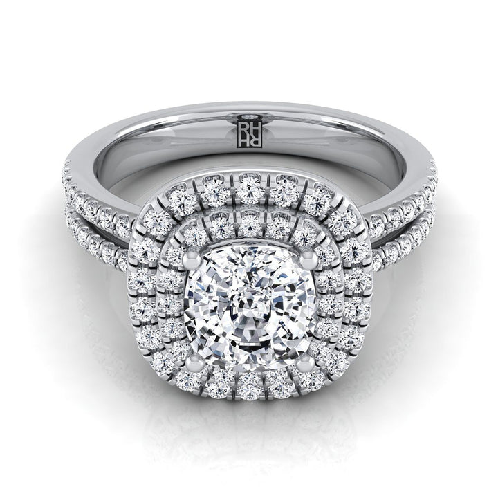 Exquisitely Handcrafted, This Double Pave Halo Cushion Cut Engagement Ring Showcases Brilliant Cut Diamonds (h-i/vs 0.45ctw) Beautifully Pave Set In A Classic 18k White Gold Setting.