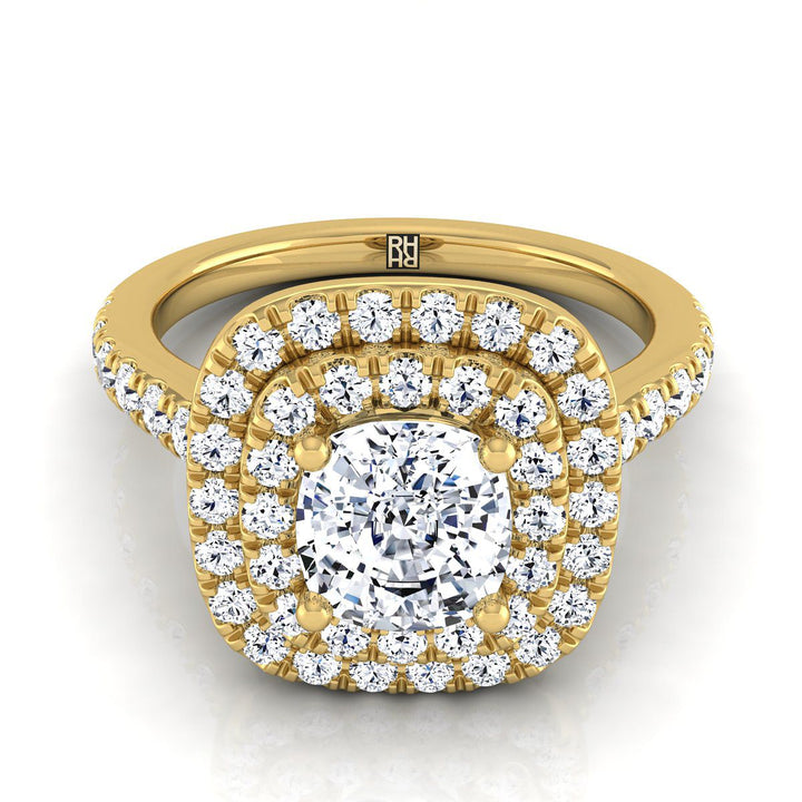 18K Yellow Gold Cushion Double Pave Halo with Linear Diamond Engagement Ring -3/4ctw