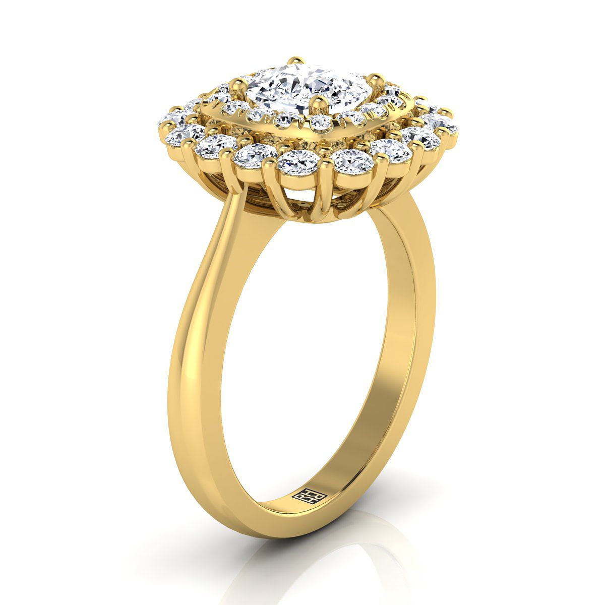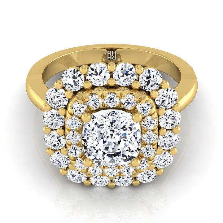 18K Yellow Gold Cushion Diamond Double Halo Floral Sunburst Engagement Ring -1ctw