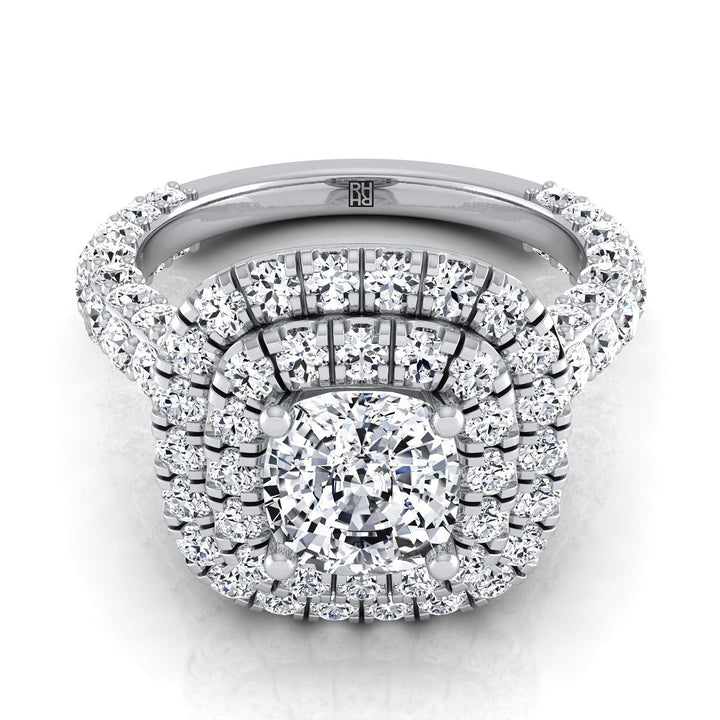 14K White Gold Cushion Diamond Bold and Fancy Double Halo French Pave Engagement Ring -2ctw