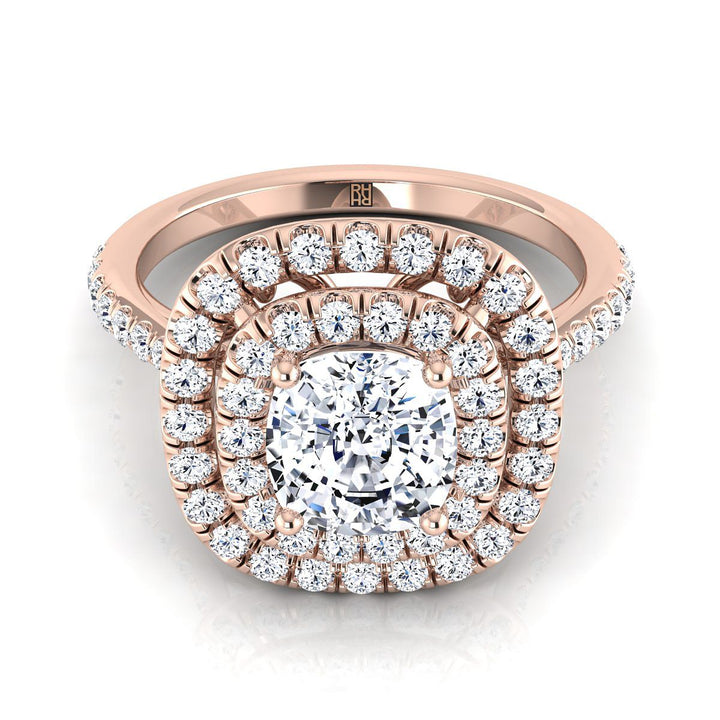 14K Rose Gold Cushion Diamond Double Halo Scalloped Pavé Engagement Ring -1/2ctw