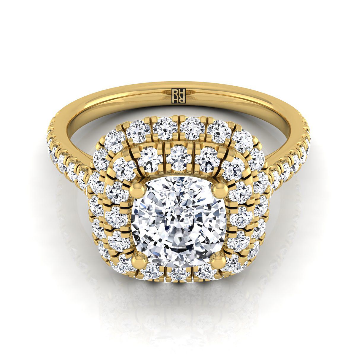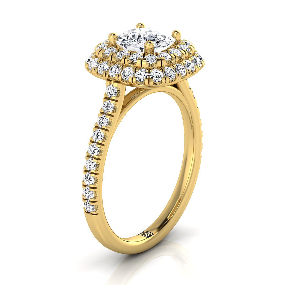 Exquisitely Handcrafted, This Cushion Cut Double Halo Engagement Ring Showcases Brilliant Cut Diamonds (h-i/vs 0.75ctw) Beautifully Set In A Classic 18k Yellow Gold Setting.