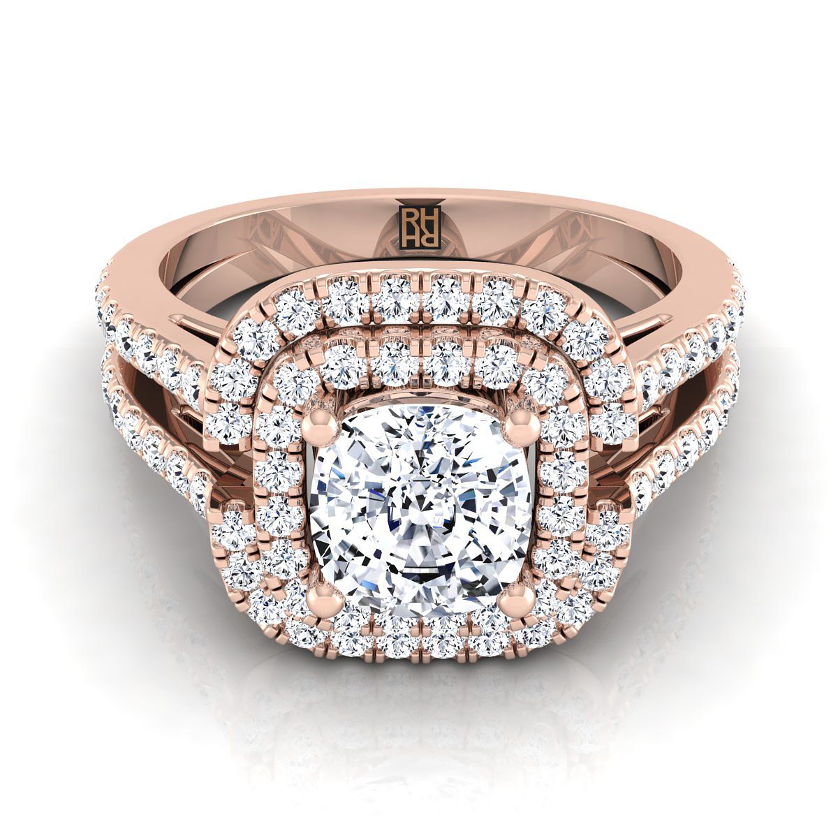 Beautifully Handcrafted, This Cushion Cut Double Halo Engagement Ring With Pave Split Shank Showcases Brilliant Cut Diamonds (h-i/vs 0.66ctw) Expertly Set In A Classic 14k Rose Gold Setting.