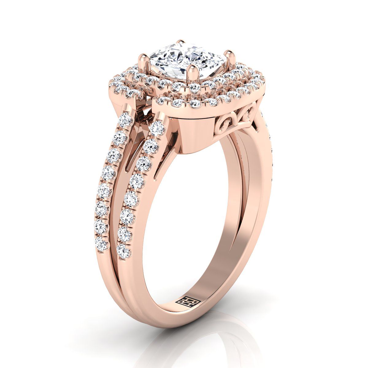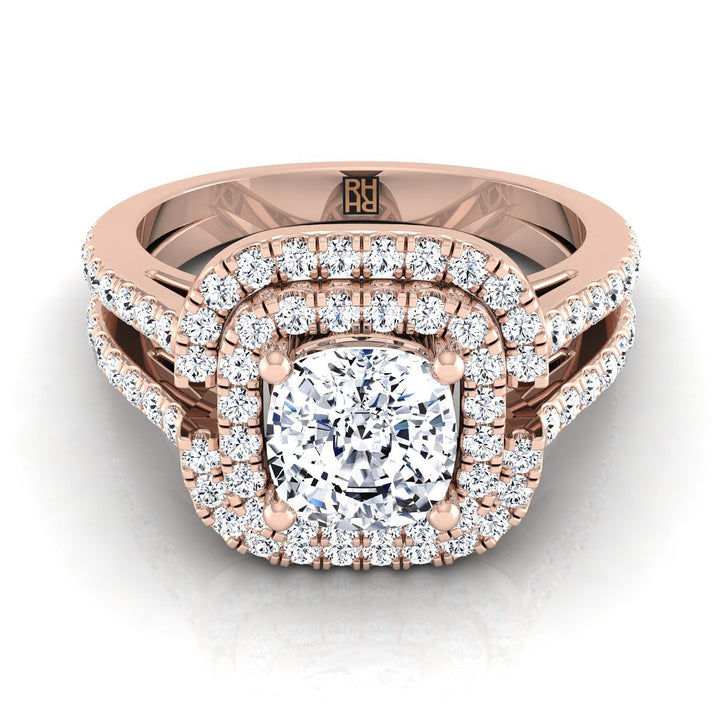 14K Rose Gold Cushion Open Double Diamond Row Split Shank and Halo Engagement Ring -5/8ctw