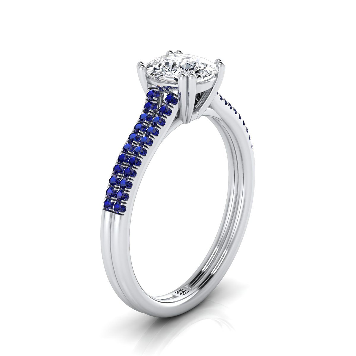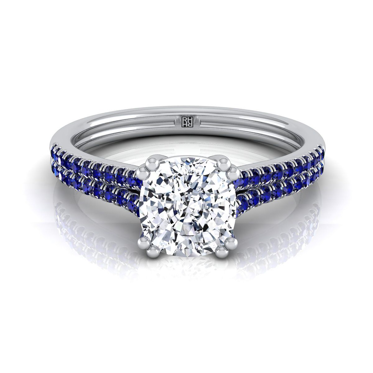 Exquisitely Handcrafted, This Cushion Cut Diamond Engagement Ring Showcases Round Sapphires Beautifully Micro U Pave Set In A Classic Platinum Setting.