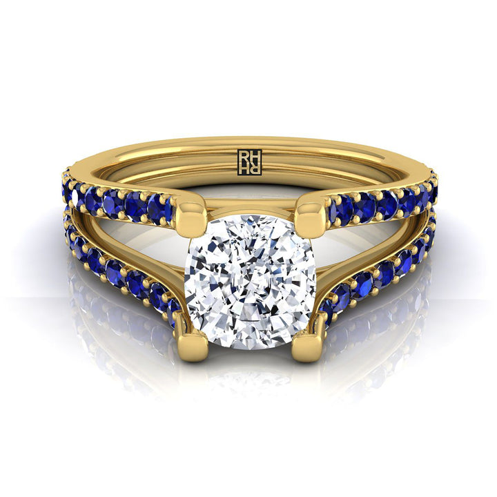 18K Yellow Gold Cushion Prong Set Sapphire Split Shank Engagement Ring