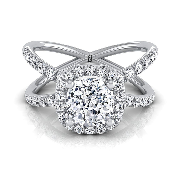 18K White Gold Cushion Diamond Open Criss Cross French Pave Engagement Ring -1/2ctw