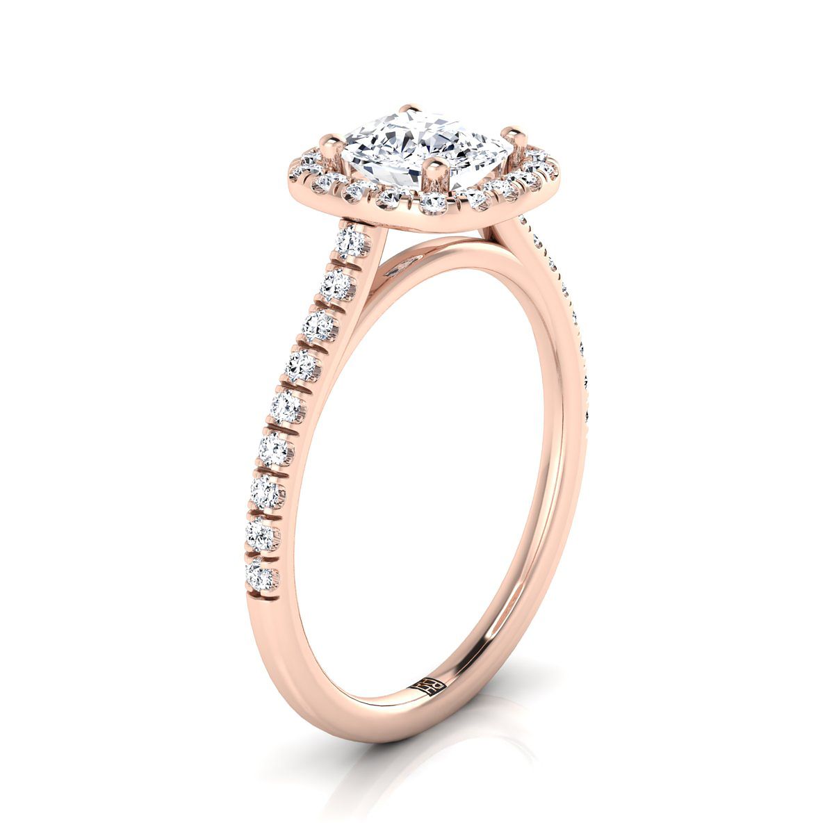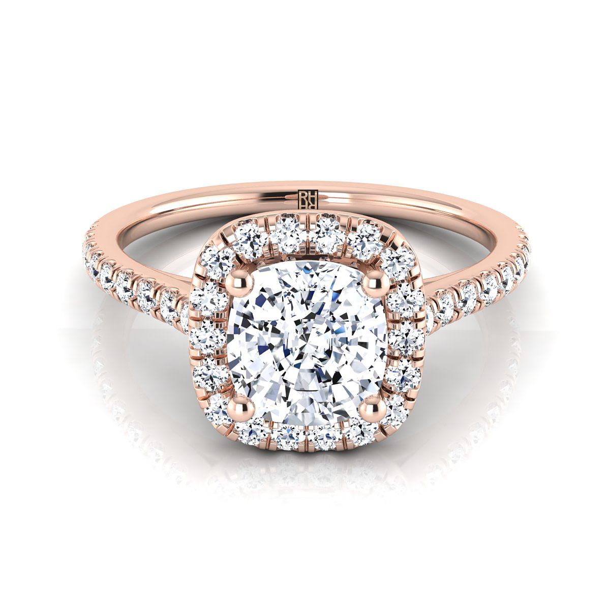 An Elegant Statement Of Style, This Cushion Cut Halo Engagement Ring With Diamond Pave Shank Showcases Brilliant Cut Diamonds (h-i/vs 0.30ctw) Beautifully Set In A Classic 14k Rose Gold Setting.